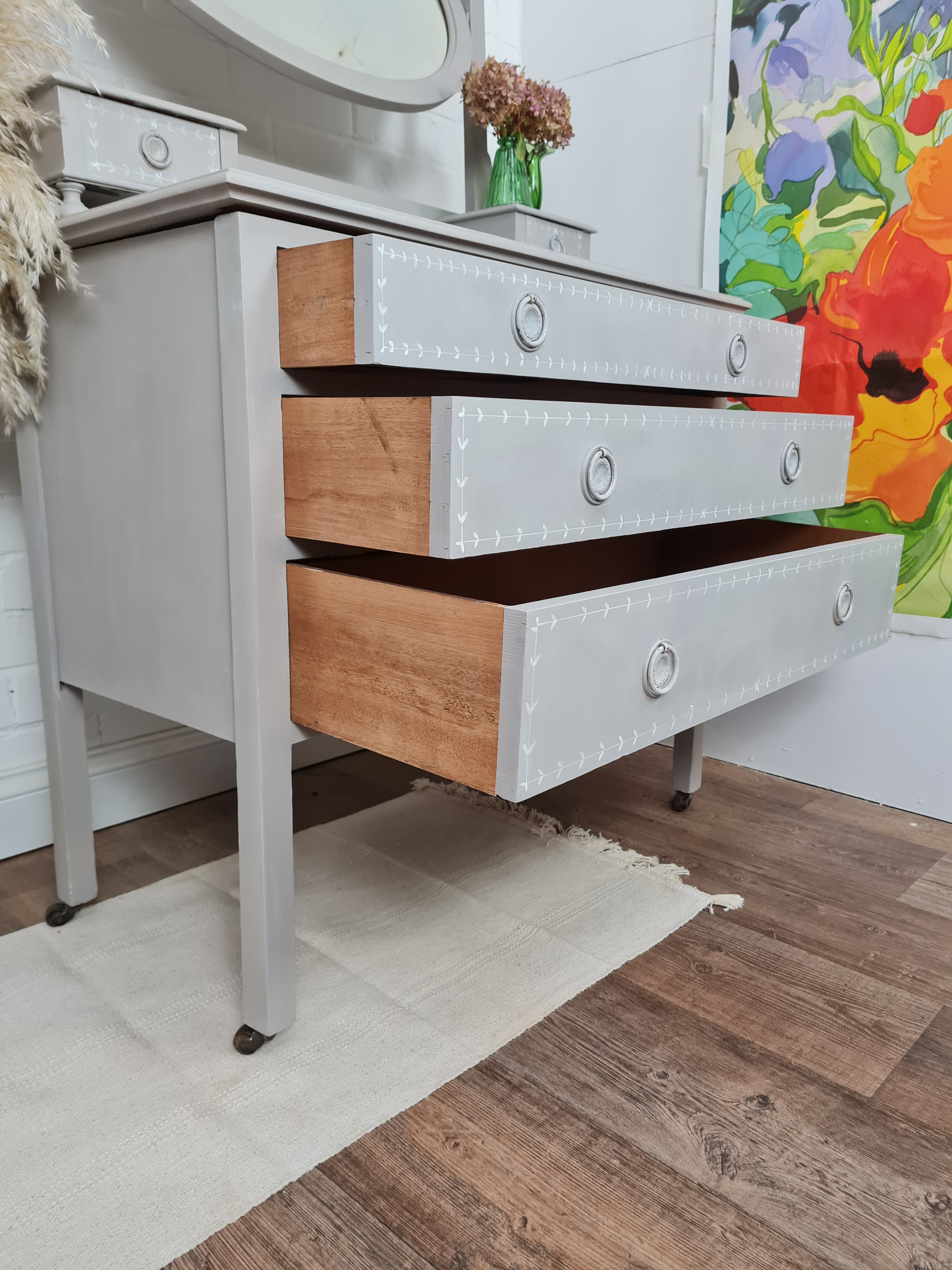 This beautifully upcycled dressing table has been painted in Cornish Mineral paint ‘Goose’ and finished in silky white wax to create a timeless appeal. The neutral colour scheme has been lifted with a hand-painted motif in white, reminiscent of Gustavian-style furnishings. There is very slight foxing to the mirror which adds to its vintage appeal. All the drawers run smoothly and the piece is on casters for easy movement. £240
