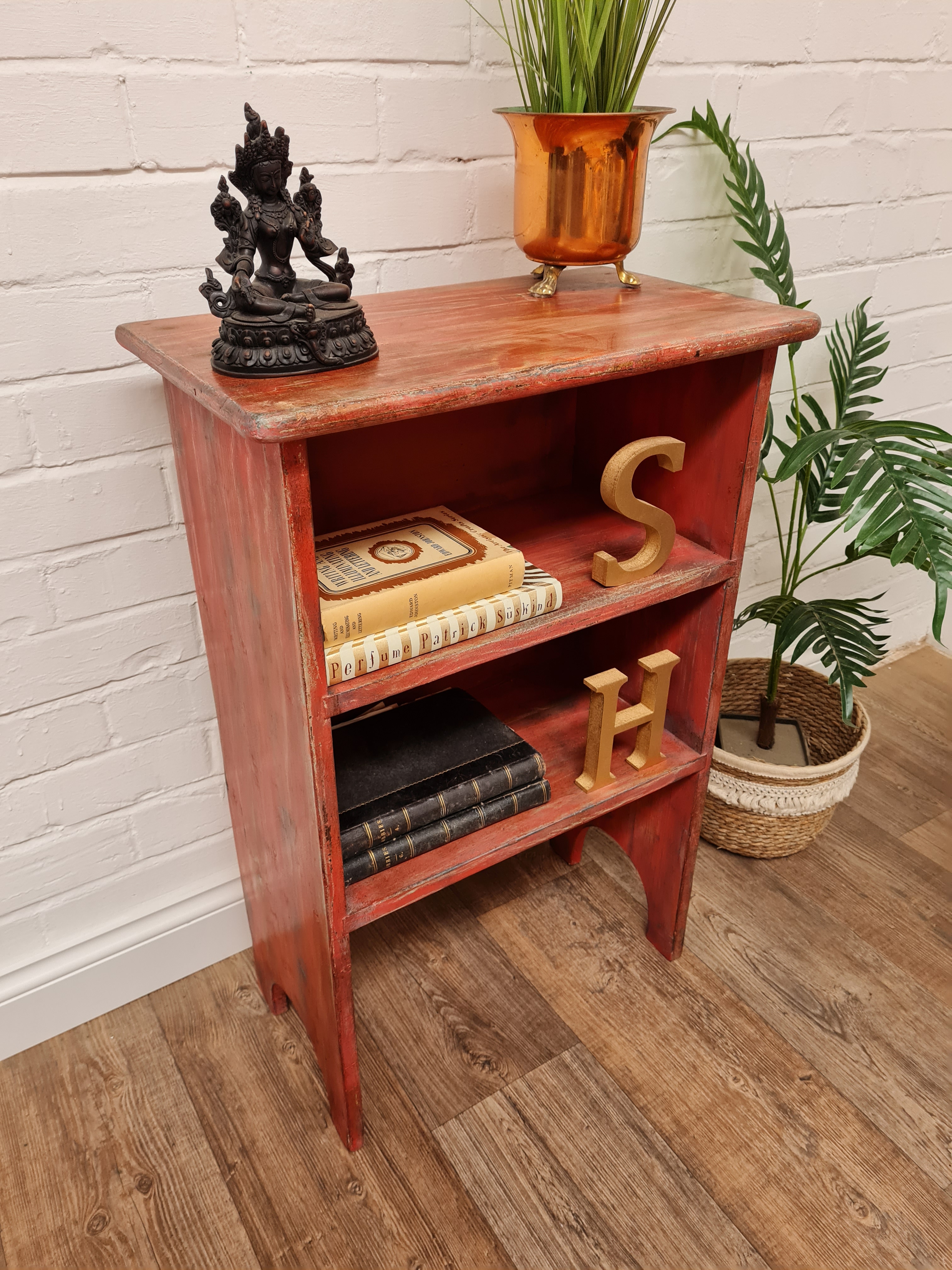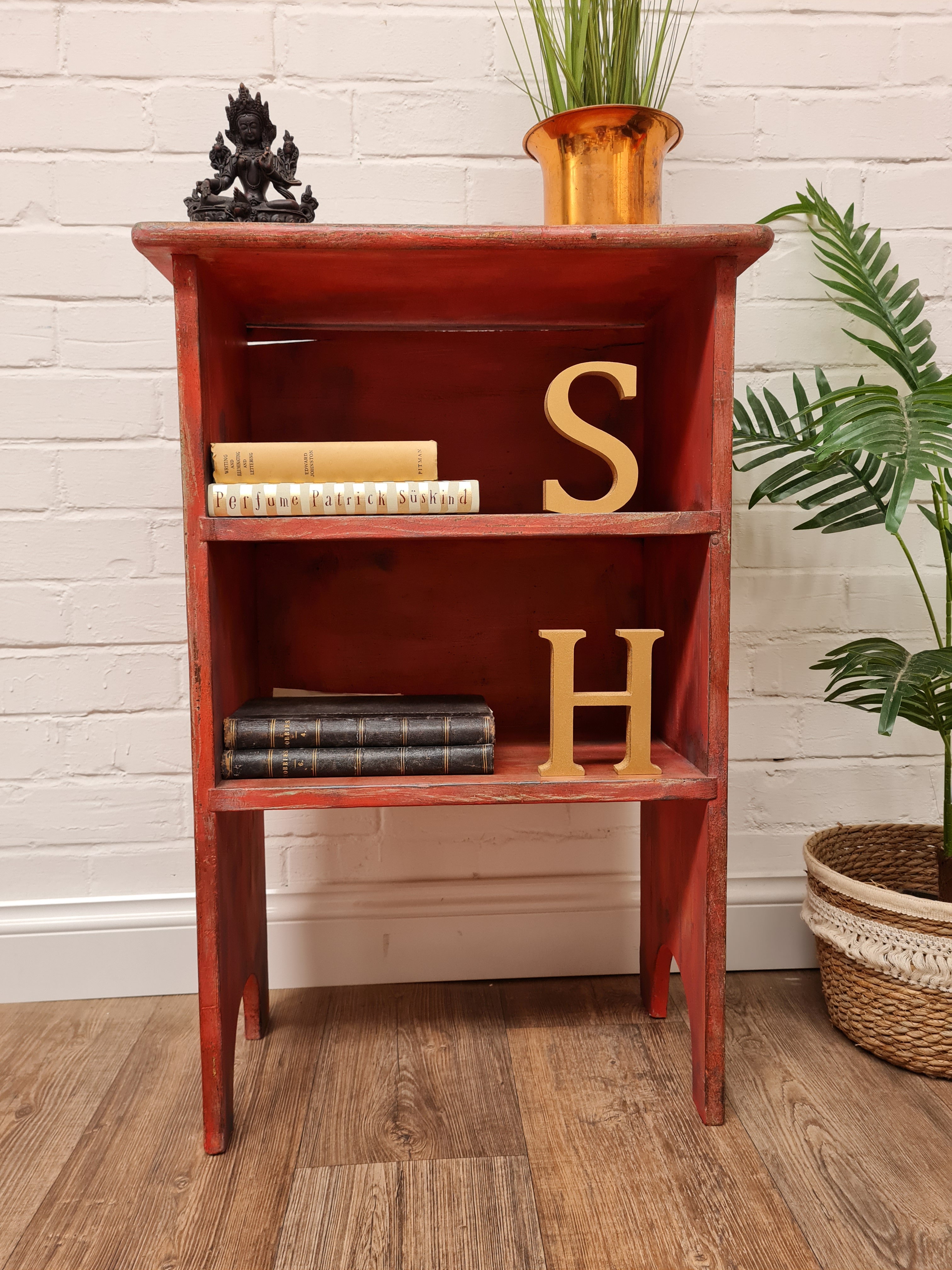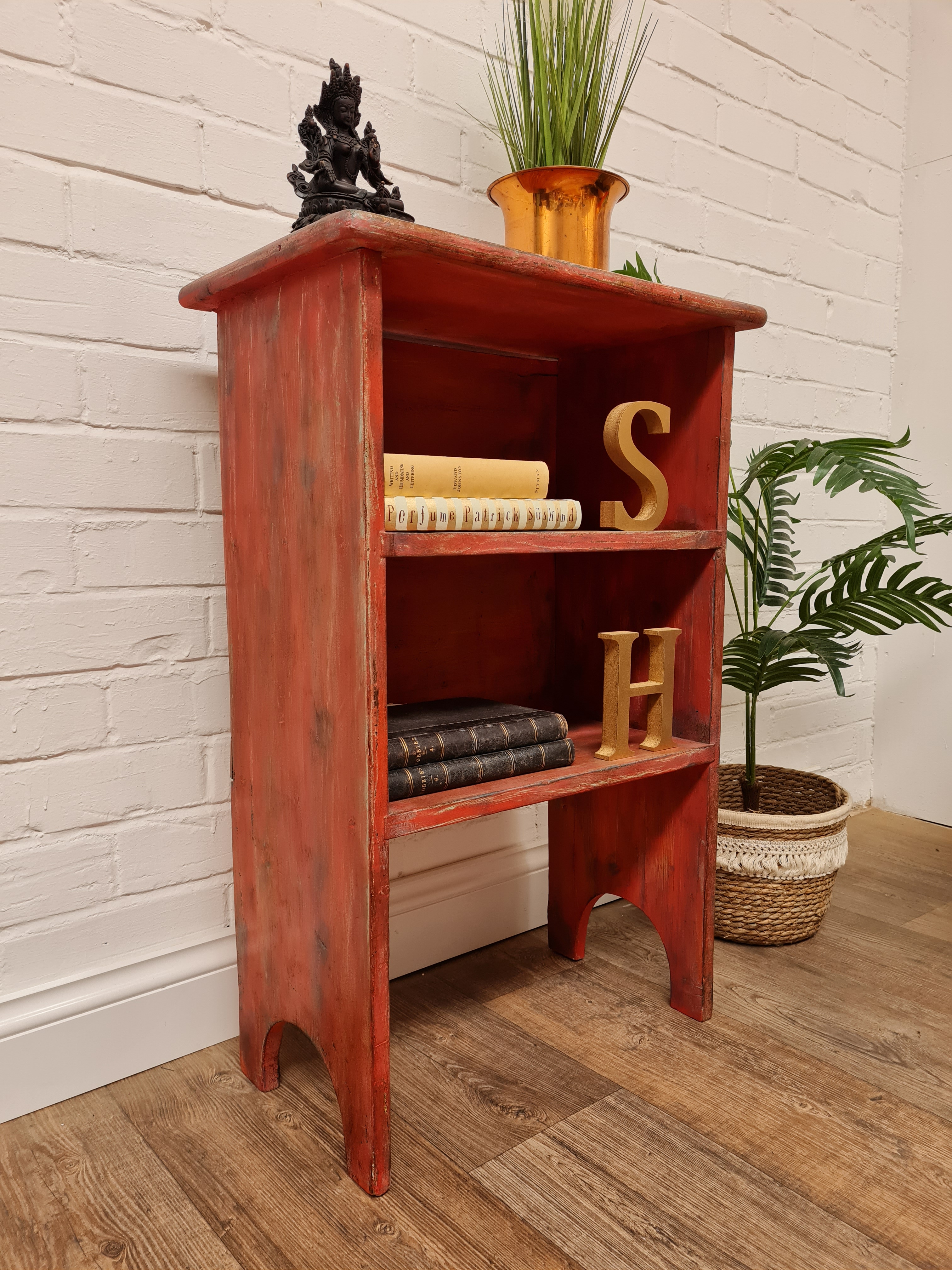 Small set of vintage shelves painted and distressed to create a rustic feel. Waxed for durability, it needs a new cottage style home!